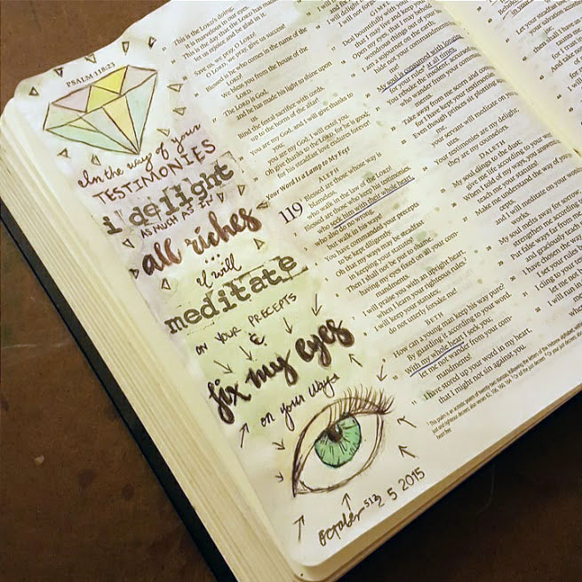 That began to change in late 2014. In addition to the understanding I received from attending Foundation Institute, I began to notice something on my social media feed. Some of my friends were using arts and craft supplies in their wide margin Bibles to create beautiful works of art, sometimes working notes in and sometimes just illustrating the main idea of a verse or passage.