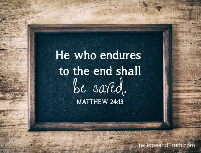 The word endure in Matthew 24:13 is translated from the Greek verb hupomeno and is related to the noun hupomone, which is often translated “patience.” Hupomone is defined as steadfastness, constancy, perseverance, endurance and “the characteristic of a man who is not swerved from his deliberate purpose and his loyalty to faith … by even the greatest trials and sufferings.”